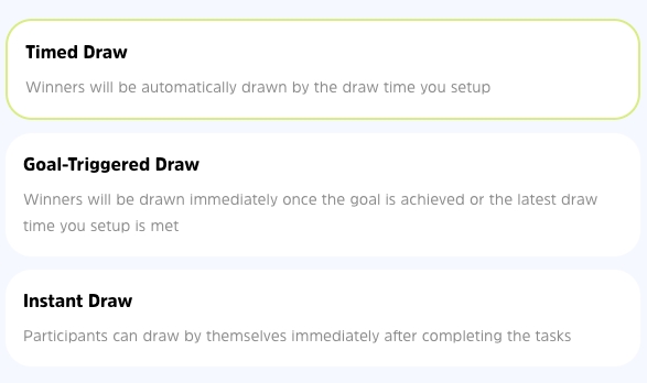 Cwallet supports 3 ways of drawing prize: timed draw, goal-triggered draw, instant draw.