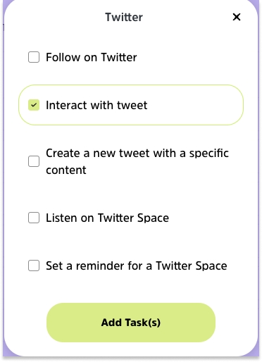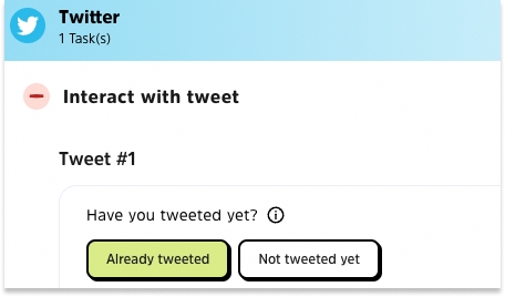 To make your giveaway more positive, you can add tasks: "Interact with tweet" Participants must interact with the specified tweets according to your requirements: Like, Retweet, Reply, and Quote.
