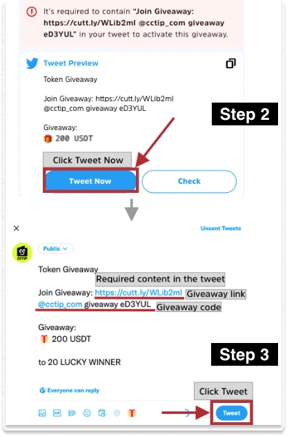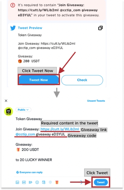 Click Tweet in the Twitter page, you may edit the content of your tweet, however, please note that to ensure that the giveaway will work, you must include the giveaway link and commands including the giveaway code as shown below.