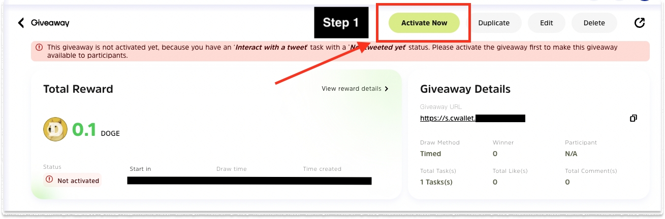 When you create a giveaway including Twitter interaction task, please make sure the giveaway tweet has been activated. If the giveaway is not activated, it is void and participants cannot join. When your Giveaway is shown like this in the Dashboard, means its status is not activated, please follow the tutorial steps to activate it and share it with your friends or community.