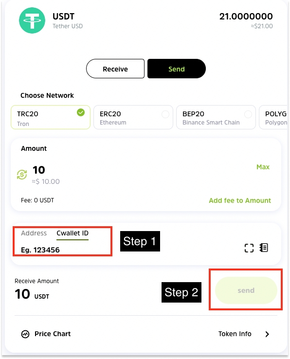 Visit Cwallet, select the token you want to transfer, and enter the recipient's Cwallet account id. (Displayed in the profile.)