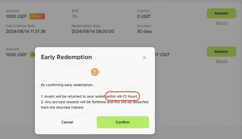 Early redemption: Only eligible to redeem the principal; the rewards will be forfeited, and the redemption will take 48-72 hours.